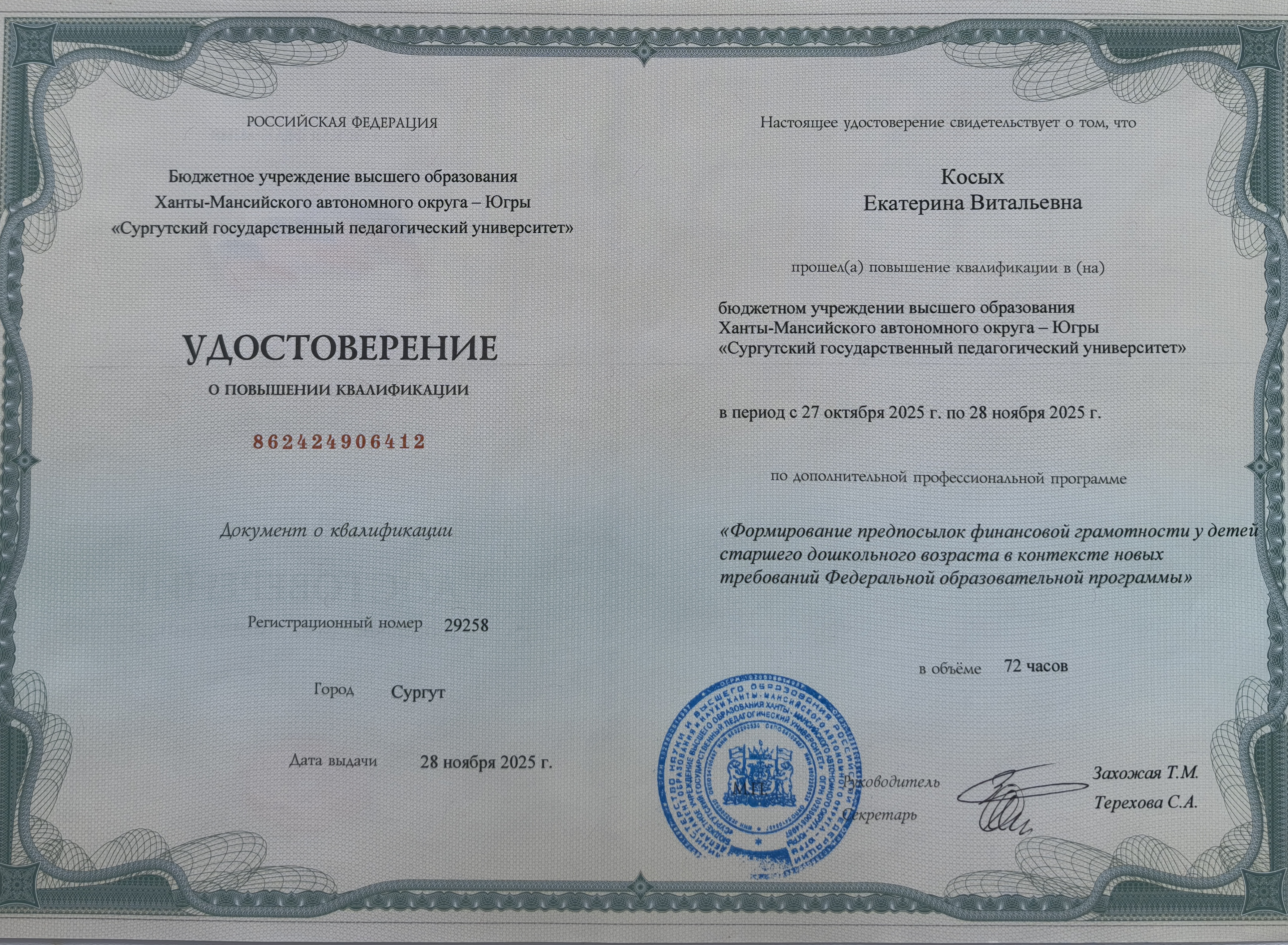 Сертификат "Финансовая грамотность в ДОО и начальной школе", 10-14 февраля 2025г